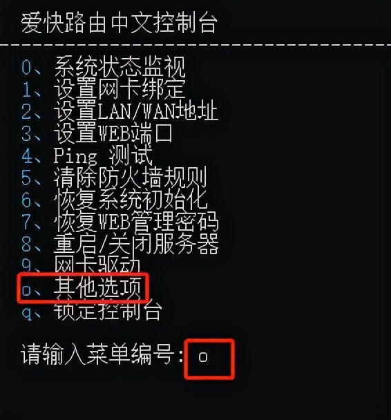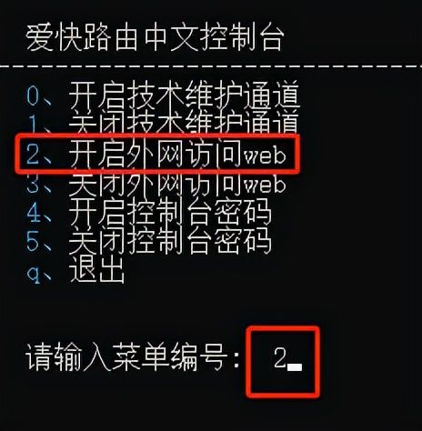 在请输入菜单编号处输入o(其他选项),然后回车,在请输入菜单编号处输入2(开启外网访问web)