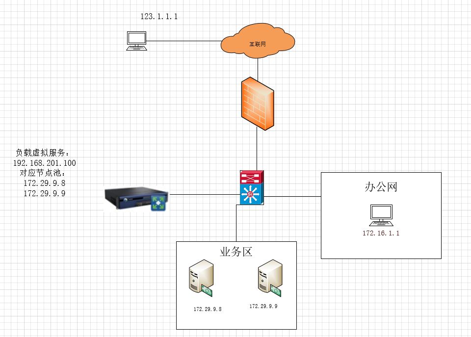 公司对外提供一个业务,这个业务做了负载分担,实际的业务地址是172.29.9.8和172.29.9.9,对应的负载上虚拟服务的地址是192.168.201.100。也就是用户访问的是负载,负载收到请求后,根据策略自动调度流量到两个服务器上。