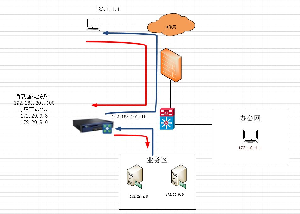 互联网用户访问业务的具体流程为:123.1.1.1访问这个业务对应的公网地址,流量到了防火墙后做地址转换,目的地址变成了负载服务地址192.168.201.100。流量到了负载上后源地址变成了192.168.201.100,目的地址 变成了主机地址,比如172.29.9.8。流量到了主机后主机回包,源是172.29.9.8,目的是192.168.201.100。流量又到了负载上,负载根据之前保存的会话,把数据包发给123.1.1.1。