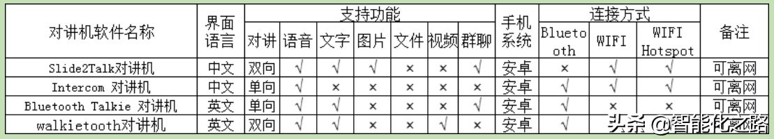 通过发掘测试了四款虚拟对讲机APP,功能对比如下图所示。这些软件各有利弊基本对讲功能没得说,操作都挺简便,不是很懂英文看图标也可以操作。这四款皆可离网通讯、无需注册,少量广告免费使用。下面简单介绍特色功能和缺点。
