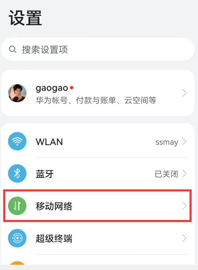 点击“移动网络”,进入到“移动网络”设置界面(如下图)。