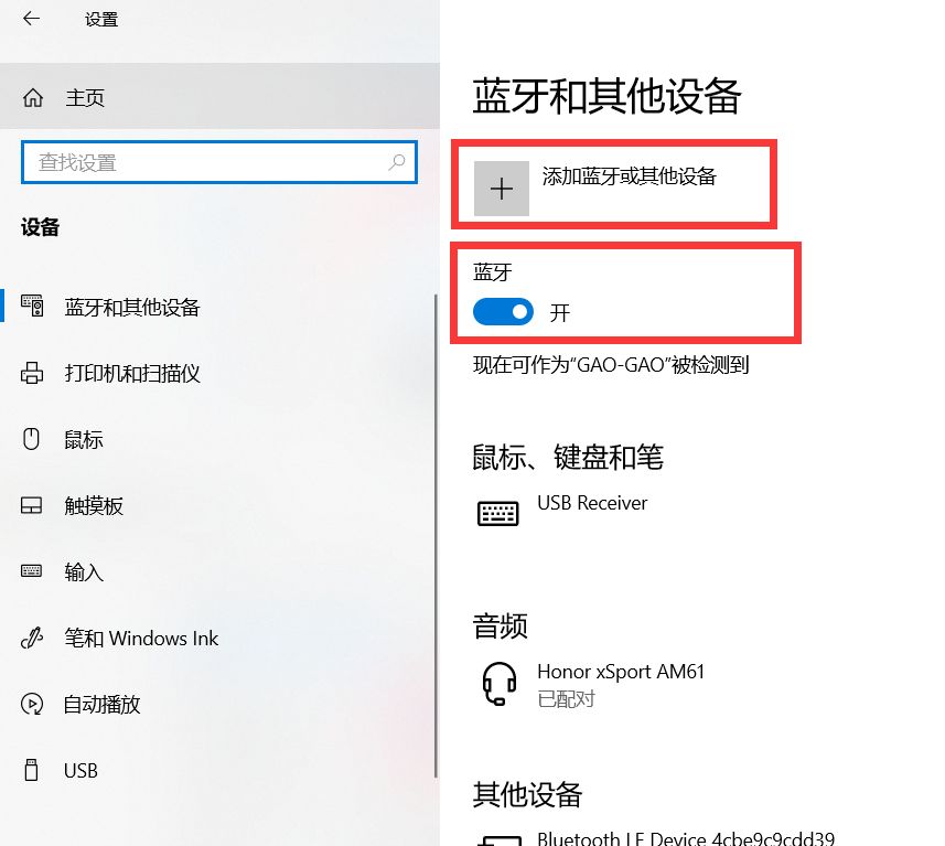 点击上图的“设备”,就会进入到“蓝牙和其它设备”界面(如下图),点击“蓝牙”开关,把它变成蓝色,就开启了。