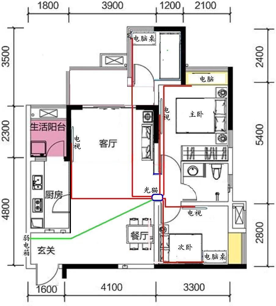 图3是大多数装修服务给的布线方案,缺点1是网线总长度长;缺点2是无线路由器在门口弱电箱中WIFI信号不好。