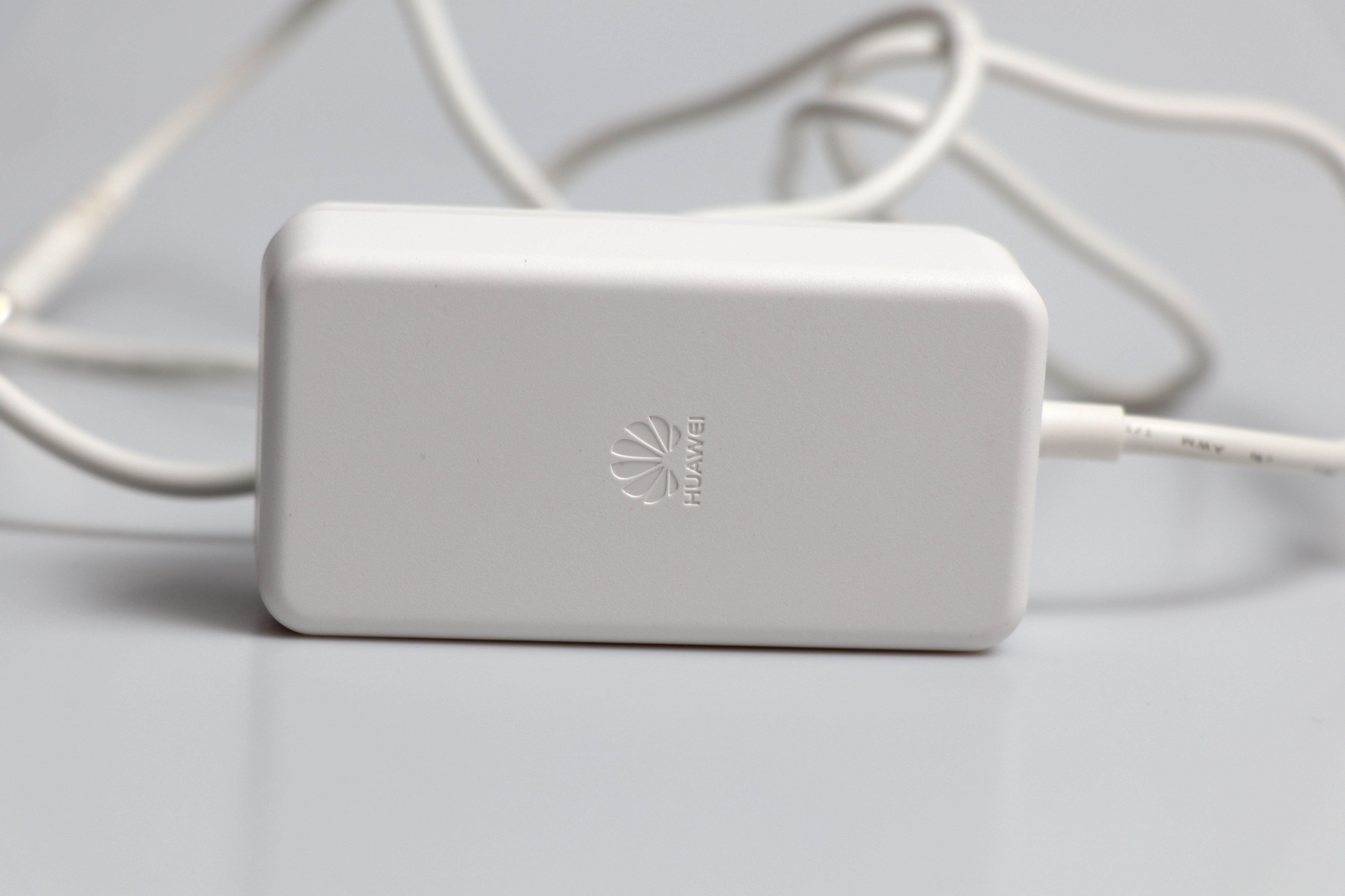 适配器正面印有华为logo,看起来做工还不错,线材比较粗,也比较沉。