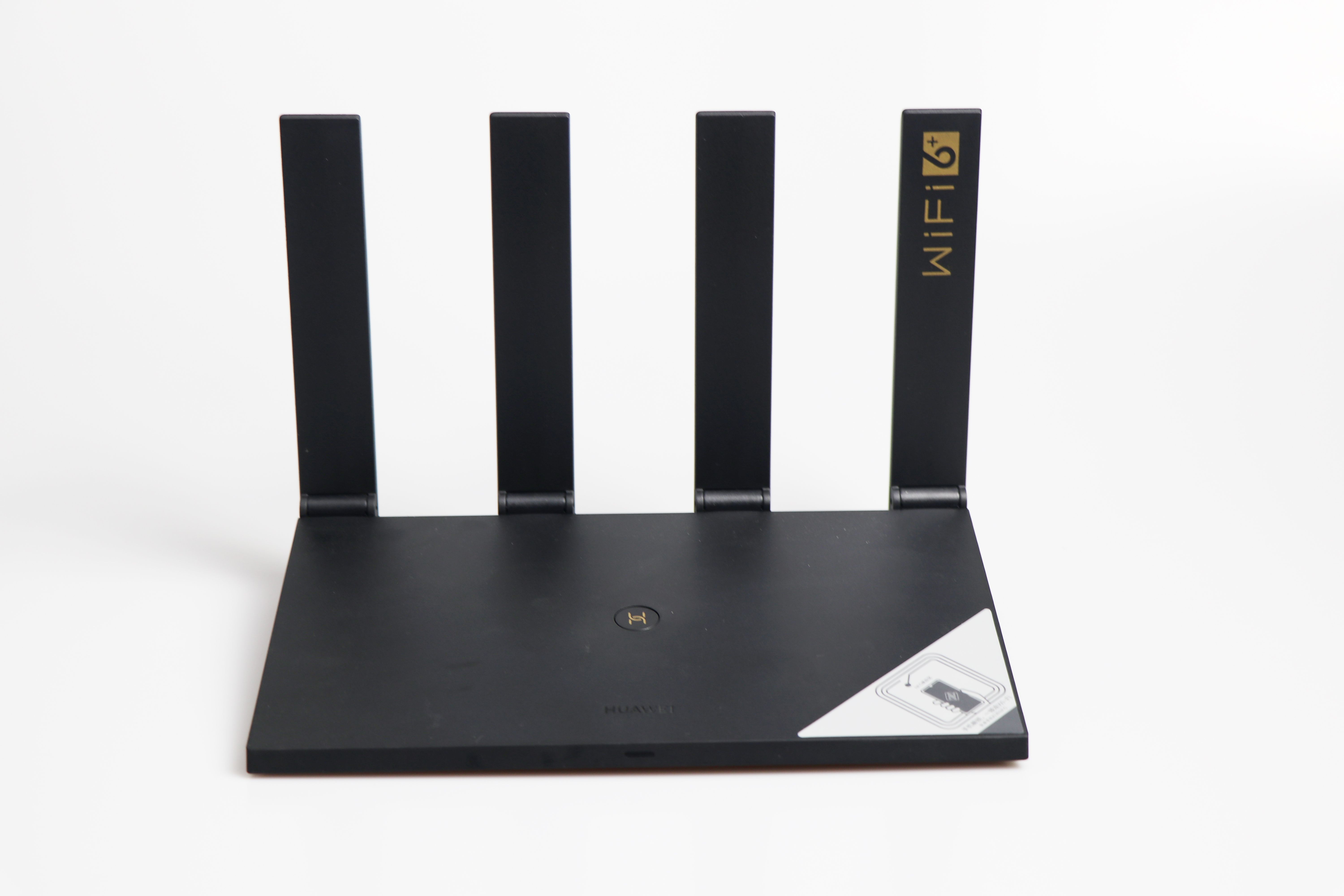下图就是华为AX3 Pro路由器的外观了,华为AX3 Pro采用了四天线的设计,天线都是扁平状的外形。路由器上的字体颜色都为金色,跟黑色的路由器很搭配。