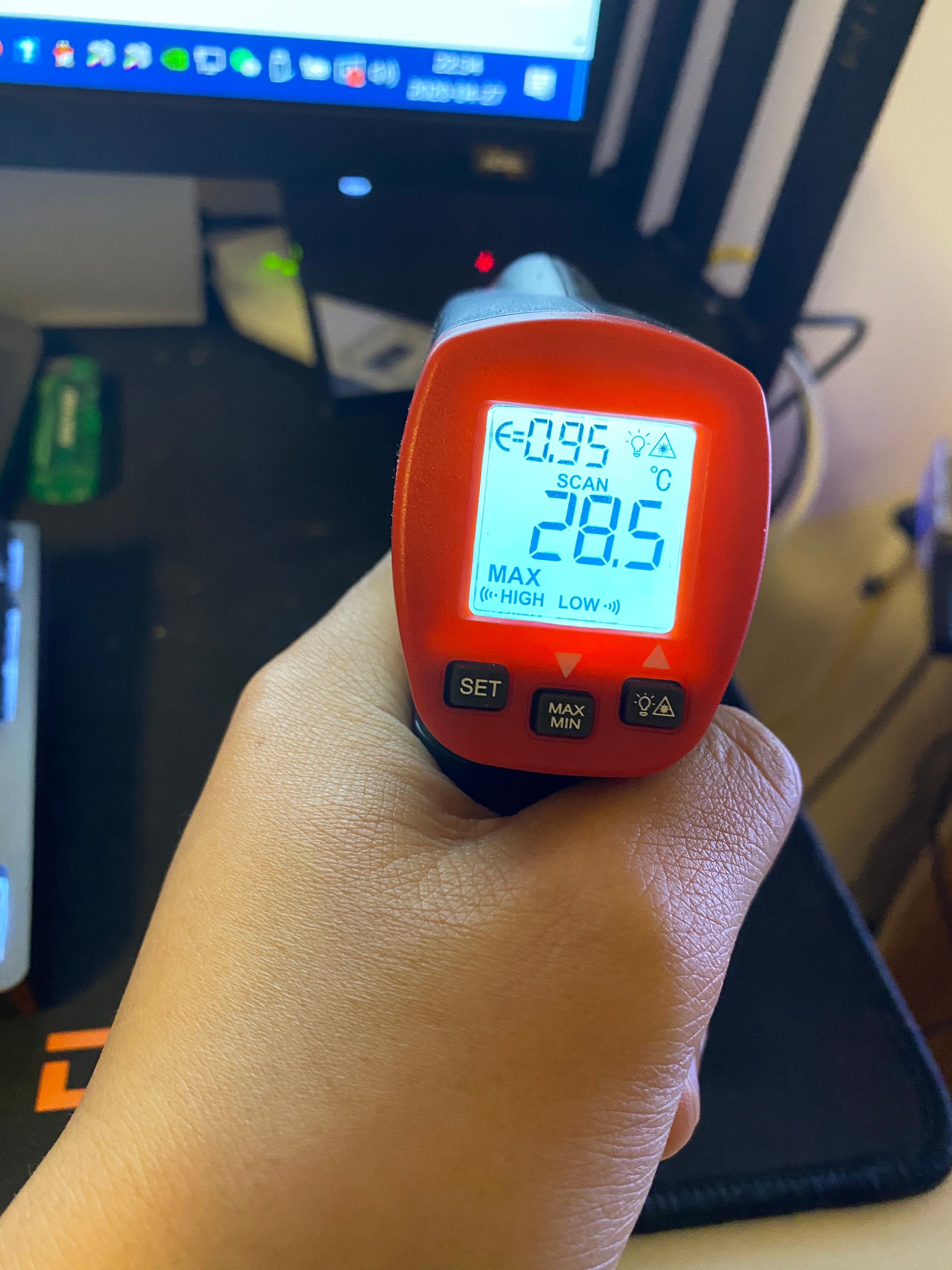 因为户型只有50多平方,房子不大,再加上路由器放在了客厅中间位置,路由器到各个房间的距离都比较短,在每个房间使用起来速度都ok。华为AX3 Pro因为在左右两侧都设计了散热孔,长时间运行温度也不会很高。下面图片是路由器连续运行了2天以上的温度测试结果,正面面板位置只有28.5℃。