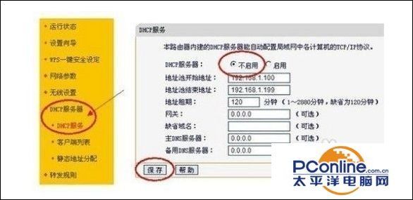 5.副路由器要设置为“不启用”DHCP功能,如下图,选好后点“保存”。