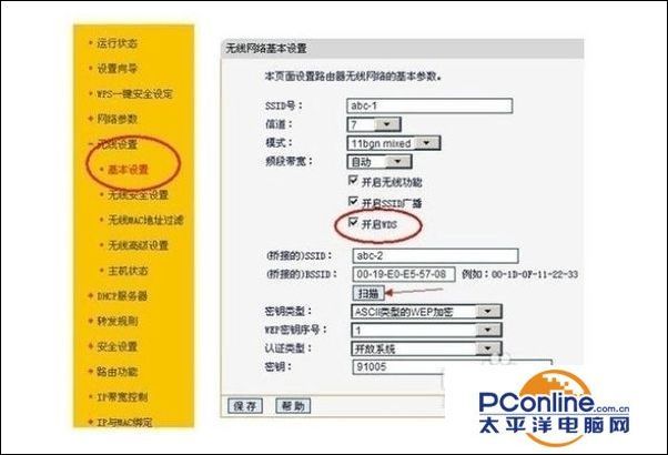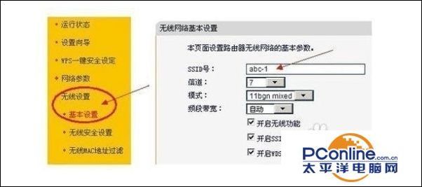3.在路由器设置菜单左侧选择无线设置的基本设置,右边的SSID号里面填上自己起的名字。注意,这两个路由器的名字要不同,例如一个叫abc-1,另一个叫abc-2 。此外,这两台路由器的信道也必须相同;并选择开启无线功能和开启SSID广播(这些本来都是默认开启的)(如下图),选好后点“保存”。