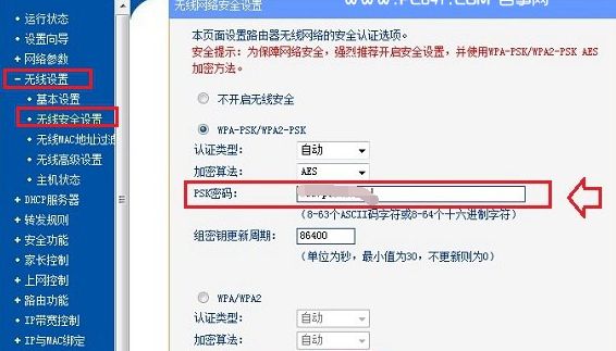 1.首先登录到路由器的后台,选择无线设置,然后登陆TP-Link路由器管理设置界面后,点击左侧菜单的【无线设置】--【无线安全设置】,然后在右侧的修改界面,将PSK密码(也就是WiFi密码)改成所需要的新WiFi密码即可,如下图所示。