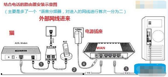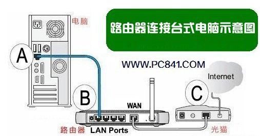 猫、路由器与台式电脑网线连接示意图
