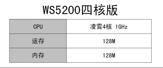 WS5200四核版比WS双核增强版的核心数量直接翻了一倍,CPU单核心频率也从0.8GHz提升到了1GHz,单核性能将近20%的提升。内存和运存也是直接一步到位,达到了双128M的水平。而价格方面,四核版本只是比双核增强版贵了50元左右,性价比真的很“香”。