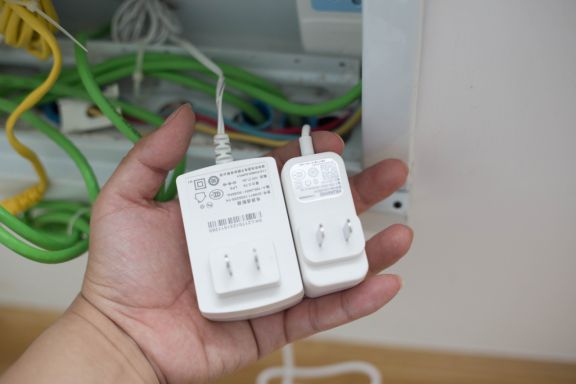 这里还值得一提的是,WS5200四核版的外置电源(右)的体积优化的很好,对比电信光猫的电源(左),可以看到这枚华为路由器的电源体积还不到光猫电源体积的一半,尤其在狭小的弱电箱内部使用,体验非常的棒,再也不用担心电源之间互相磕碰以致于插不上了。