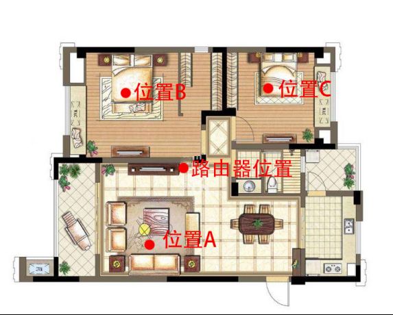我家面积是85平米,测试时,华为WS5200四核版放在客厅的弱电箱位置,分别测试测试A,B,C三个位置的信号表现。