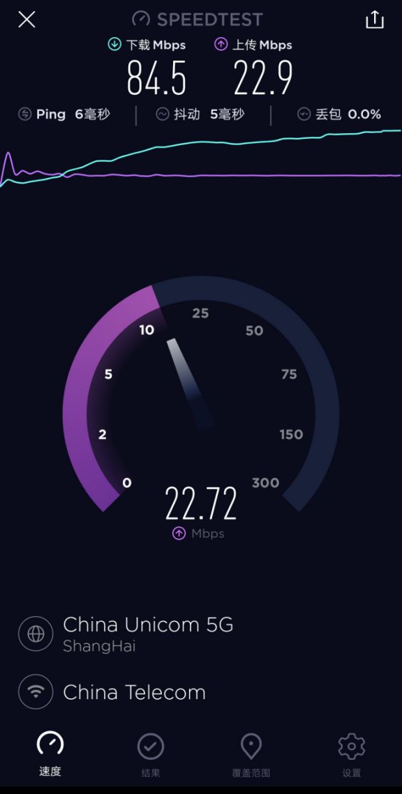 用手机连接5GWIFI,测试结果,虽然速度方面略有下降,但是稳定性方面的表现,例如抖动和丢包全部都有提升。
