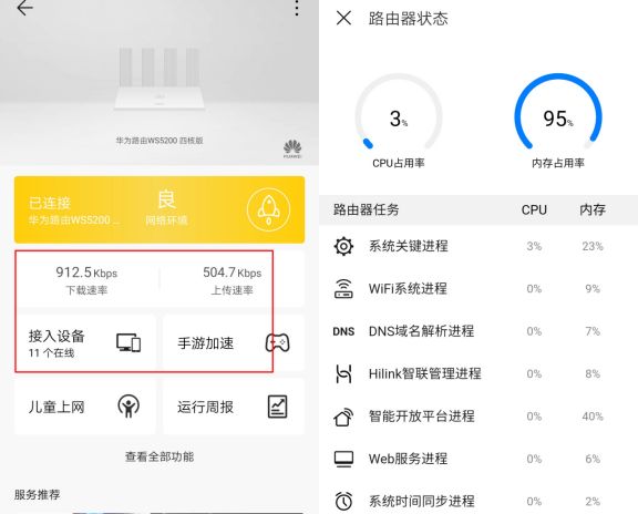 简单测试了下,11台设备同时在线,其中2个房间4台智能音箱在播放不同的在线音乐,2台手机一台在玩微信的内置游戏,一个刷微博。此时路由器CPU的占用率也只占用了3%,四核CPU带来的性能提升相当的惊人,要知道之前家里使用斐#K2路由器的时候经常是满载100%状态的。