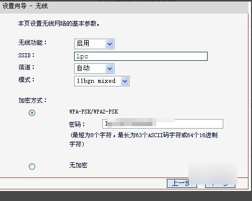 7、输入SSID名称(即路由器的无线网络名称),选择无线安全选项,设置密码(如果防止别人蹭网,密码可以设置复杂点。