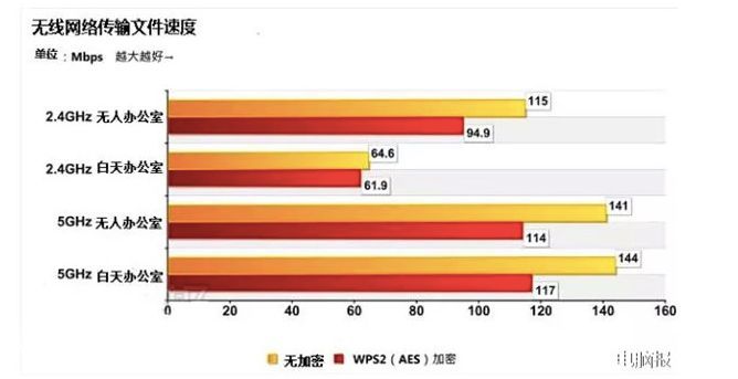 如果是在只有笔者一人的办公室中,采用2.4GHz无加密的速度为115Mbps,加密后也有94.9Mbps的表现,与白天办公室的表现明显不同。至于5GHz方面则表现很稳定,无加密约141Mbps,加密后114Mbps,几乎没有任何变动。