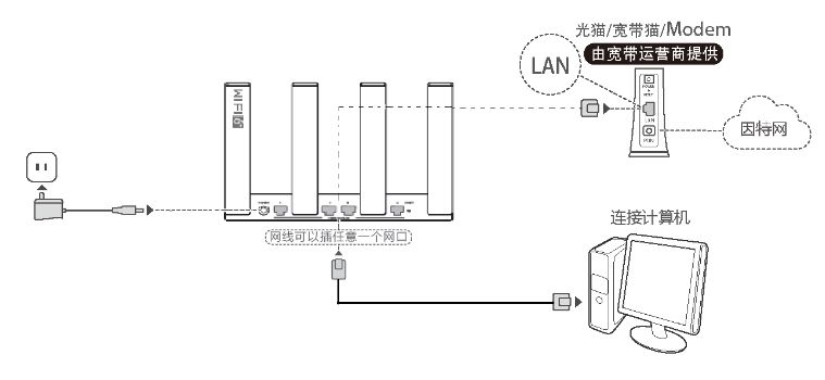 - 首先,路由器先接通电源,然后WAN口连接到宽带进线(光猫、入户网线等),路由AX3 Pro是不区分WLAN/LAN口的,支持盲插,自适应网络。