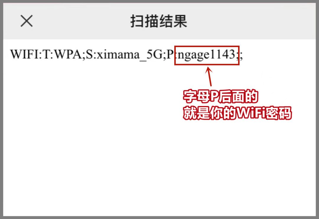 用另一台手机的微信扫描它,会弹出一串字符,其中字母P后面就是WiFi密码。