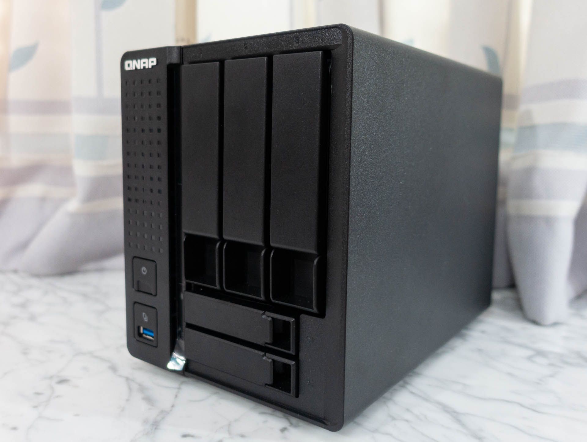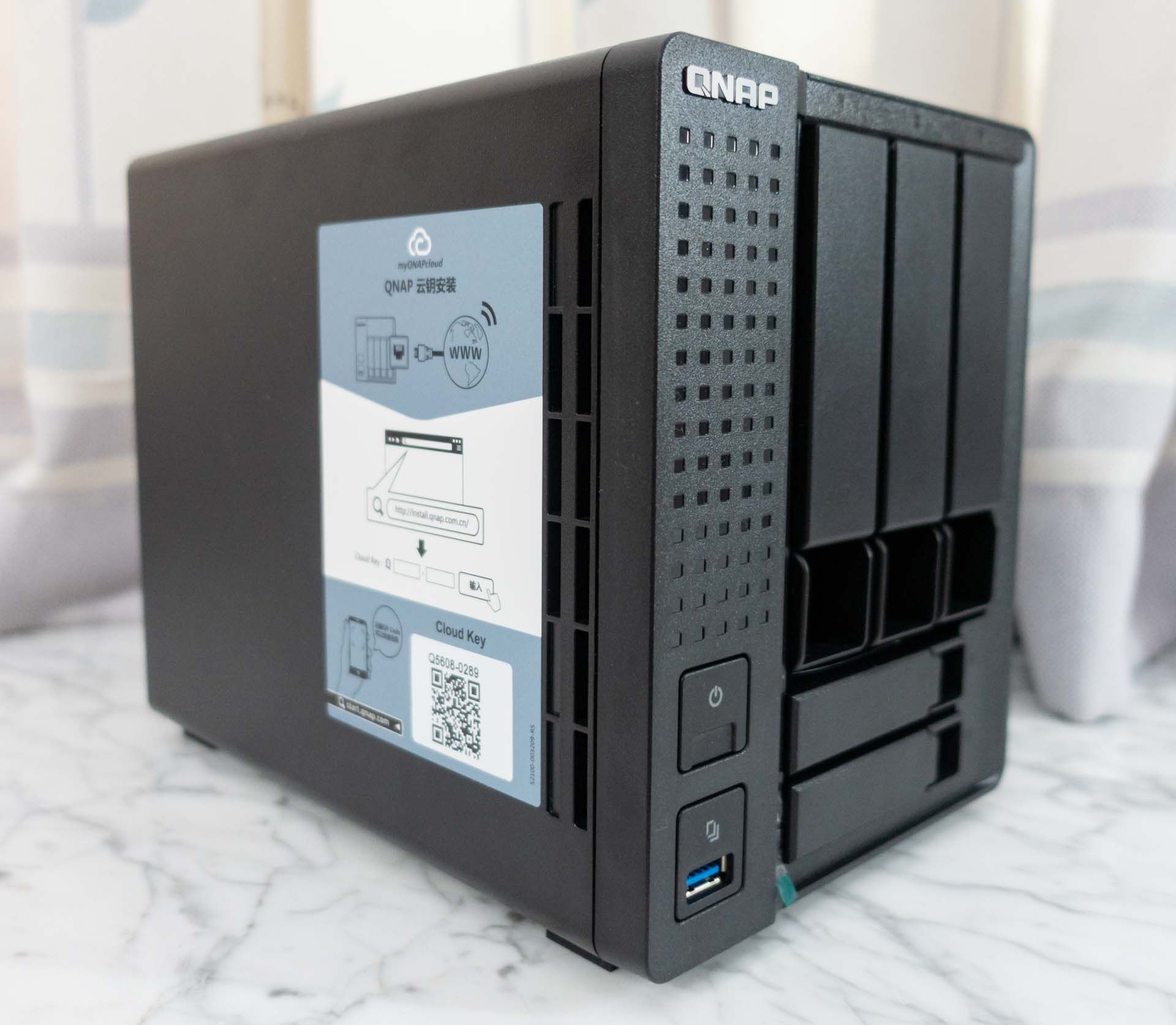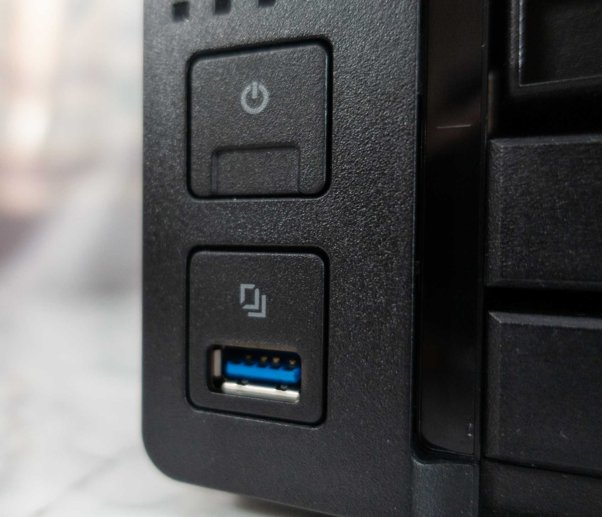 TS-532X正面左下角有两个按钮,一个包含了前置USB3.0接口,方便快速备份U盘或者读卡器数据到NAS,另一个就是开机键了,机身整体都是磨砂设计,比之前买的威联通TS-453B mini的钢琴烤漆好了许多,因为不易留下指纹和划痕了。