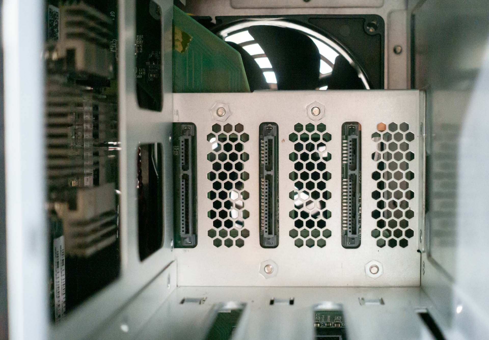 机箱内部三排竖插硬盘接口,蜂窝散热造型做工不错。