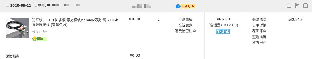 其实自己配SFP+网线目前也不算太贵,一个是普及率不高的情况下,买的人不多,好多还是企业剩下来的,28元一根淘了3米带光模块Mellanox万兆SFP+网线,算上运费也还好。