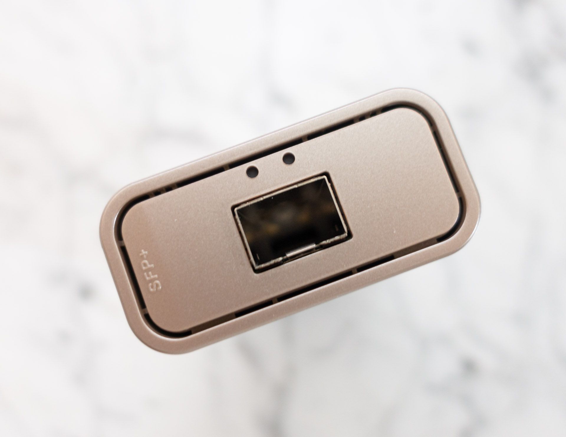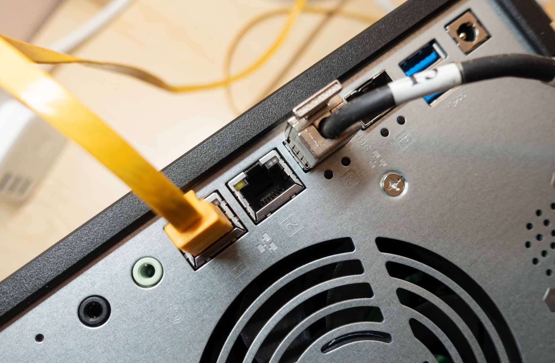 背后接上一根千兆网线连接路由器,然后SFP+万兆网线连接威联通T310G1S万兆转换器。