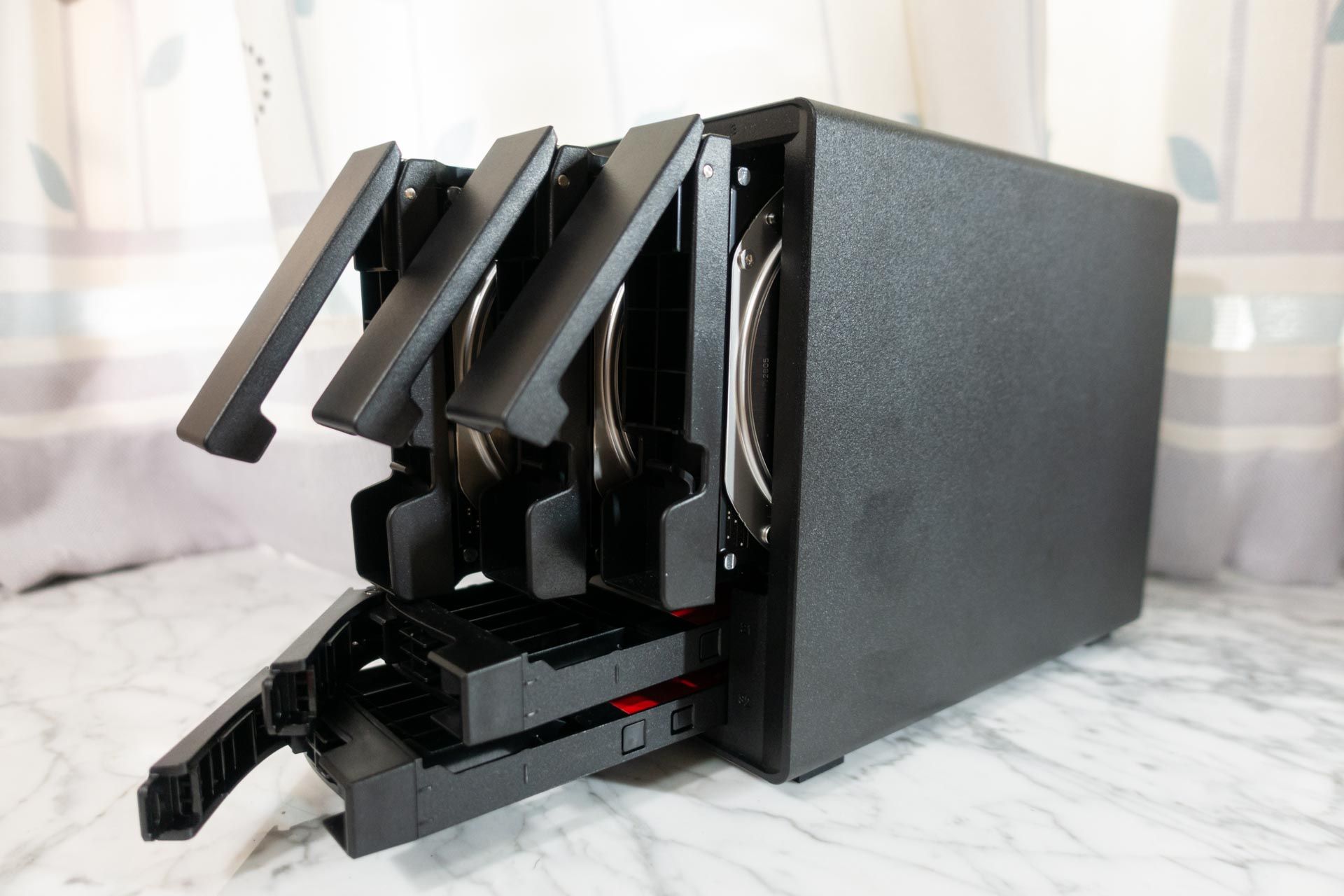 全部塞进去,分量就起来了,注意3.5最大支持16TB,2.5最大支持1T,也就是理论上50TB空间最大,而且威联通是支持热插拔的。