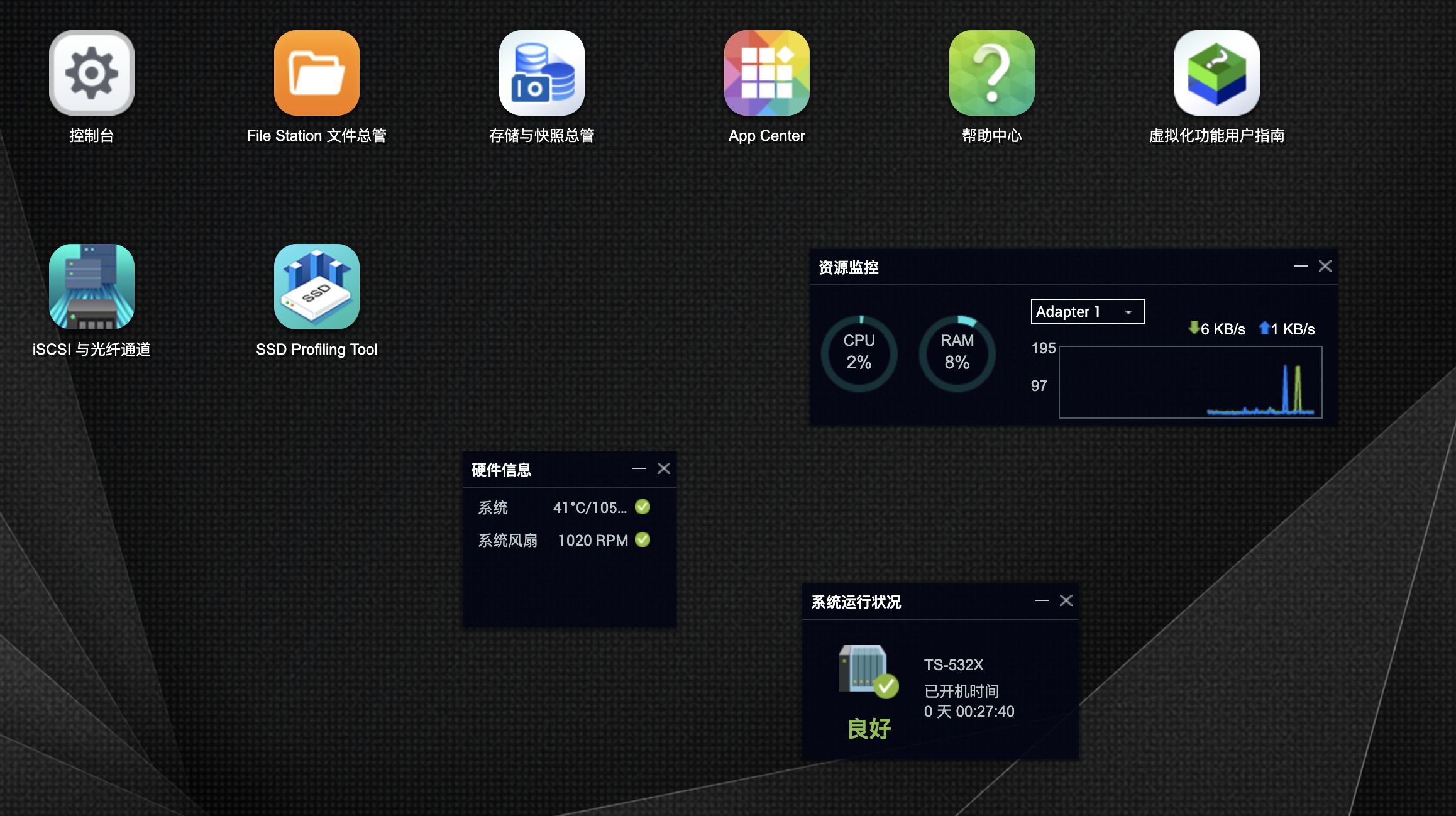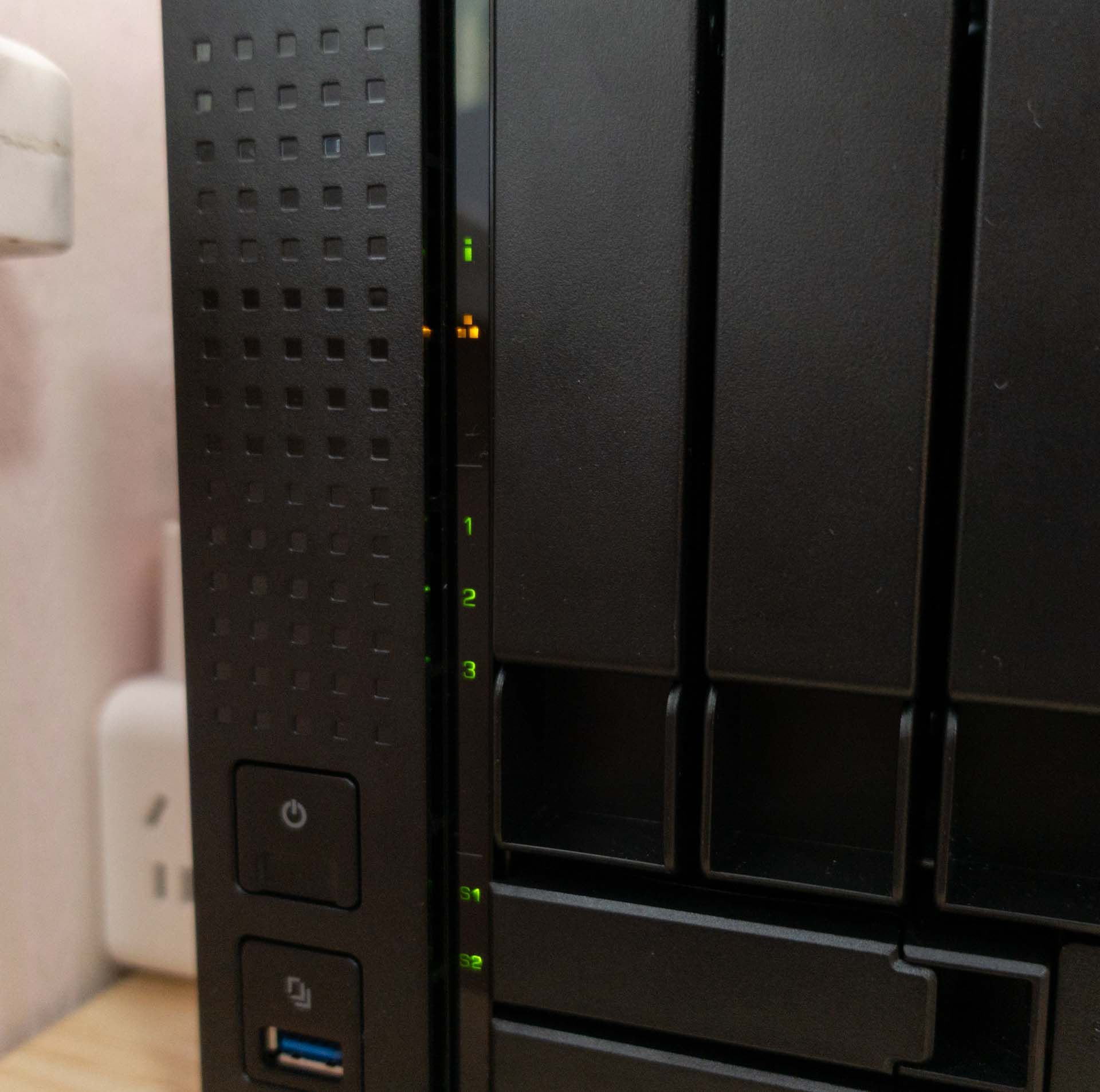 开机!TS-532X每次开机只有第一次风扇会全速运行一下,后面就完全静音了,可以说比换了风扇的蜗牛星际声音还小,只听见硬盘的炒豆子声。指示灯亮起的感觉很好,成品NAS可以一目了然系统和硬盘状态,硬盘灯频闪就代表在读写中。