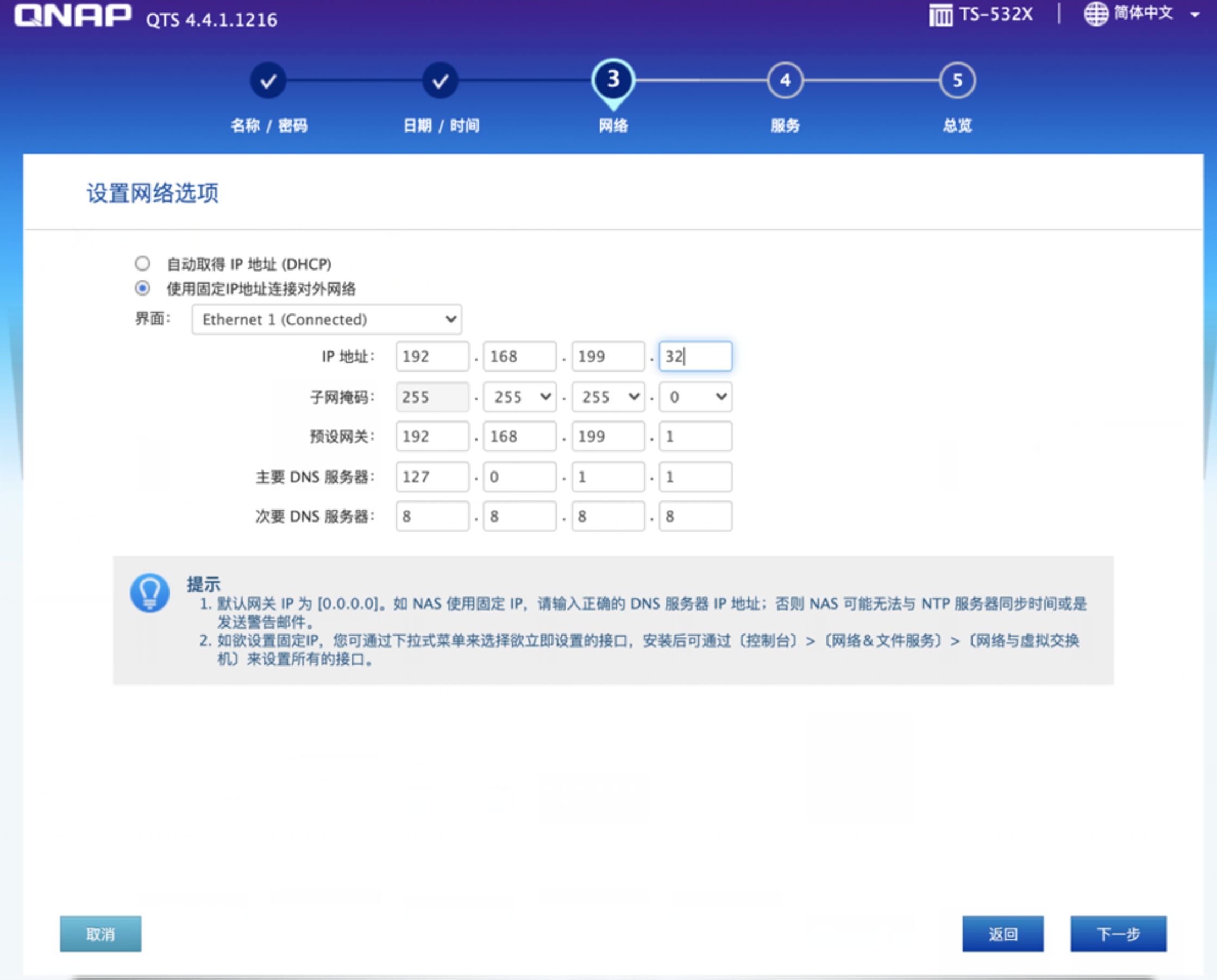按着步骤顺序其实很简单的,有几个点提一下,设置网络选项这里建议手动指定IP地址,因为NAS作为频繁登录的系统,固定IP会很方便记忆。
