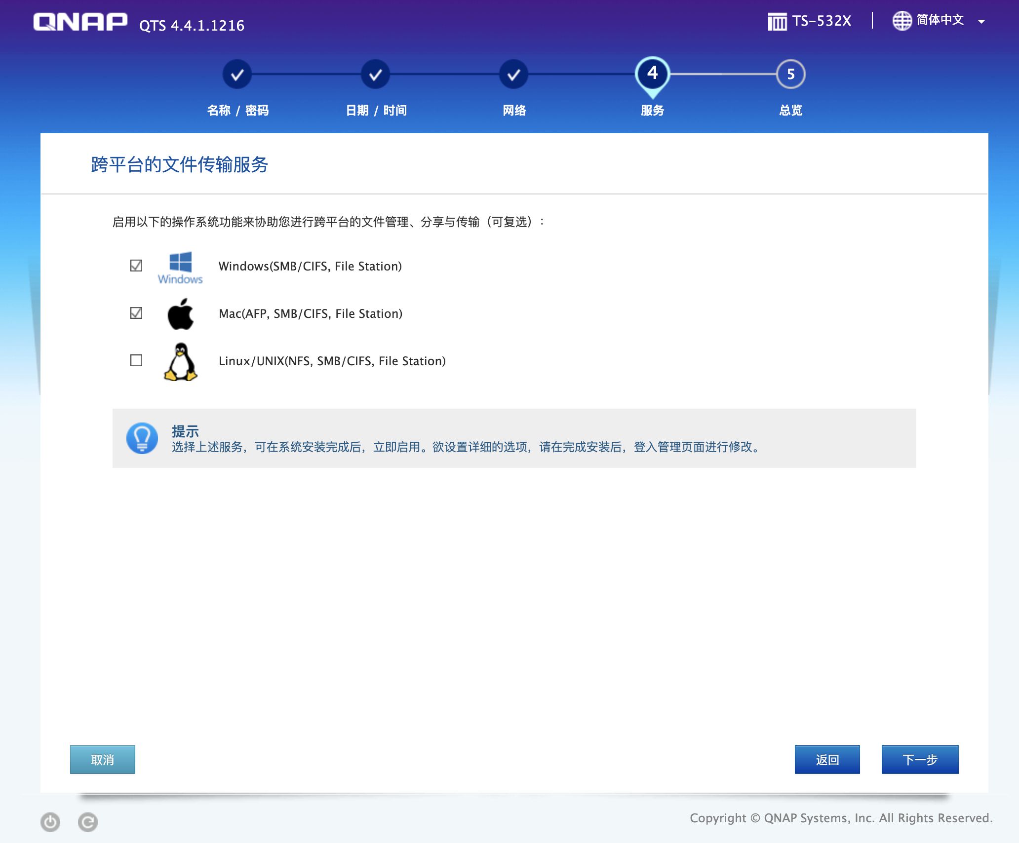 跨平台的文件传输服务按需求勾选,或者干脆全勾选,以后也可以在设置选项里更改。