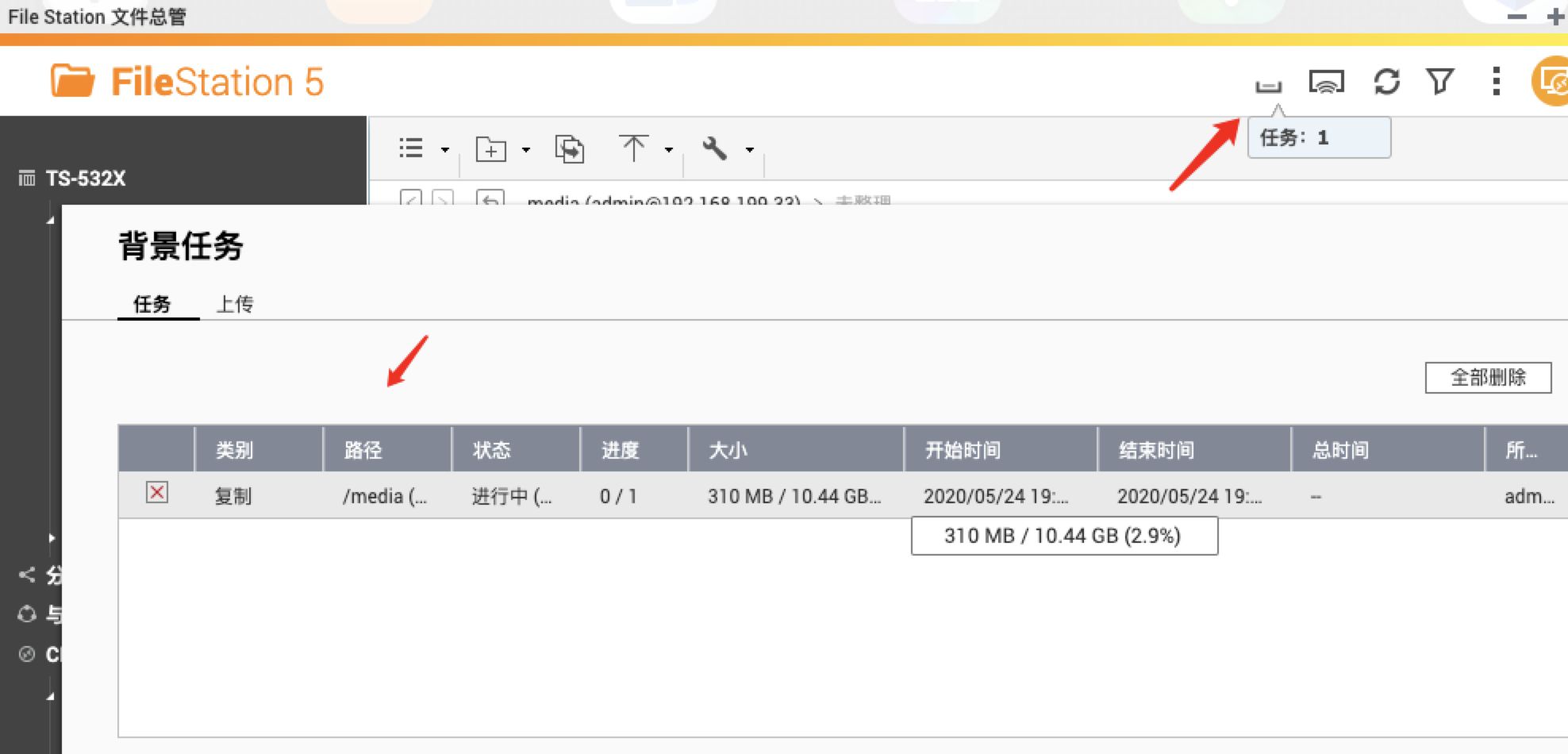 后台任务可以直观的看到NAS正在处理的任务,不过要注意文件传输进程在这个地方是看不到的,也是在FileStation5里会单独有一个后台任务查看文件传输。