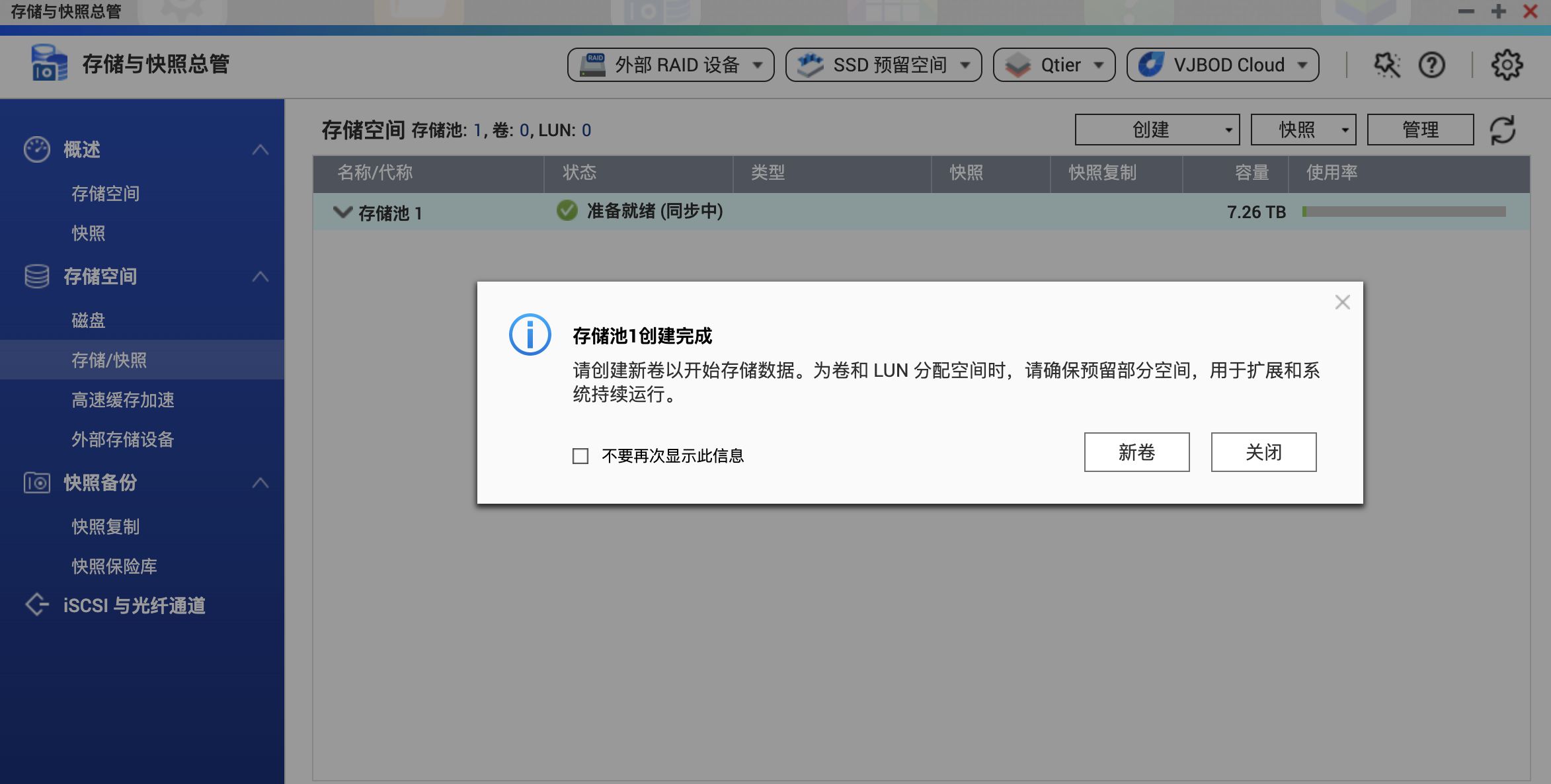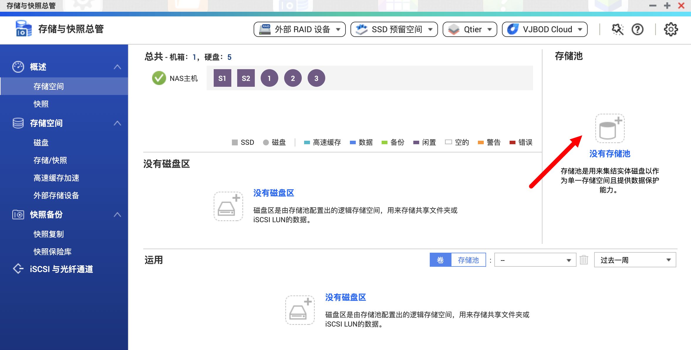 在体验万兆之前,还需要配置一下硬盘,毕竟文件传输功能是NAS最基本也是最重要的功能,首先进入存储与快照总管,没有存储池需要先创建一个存储池,点击最右侧新建。