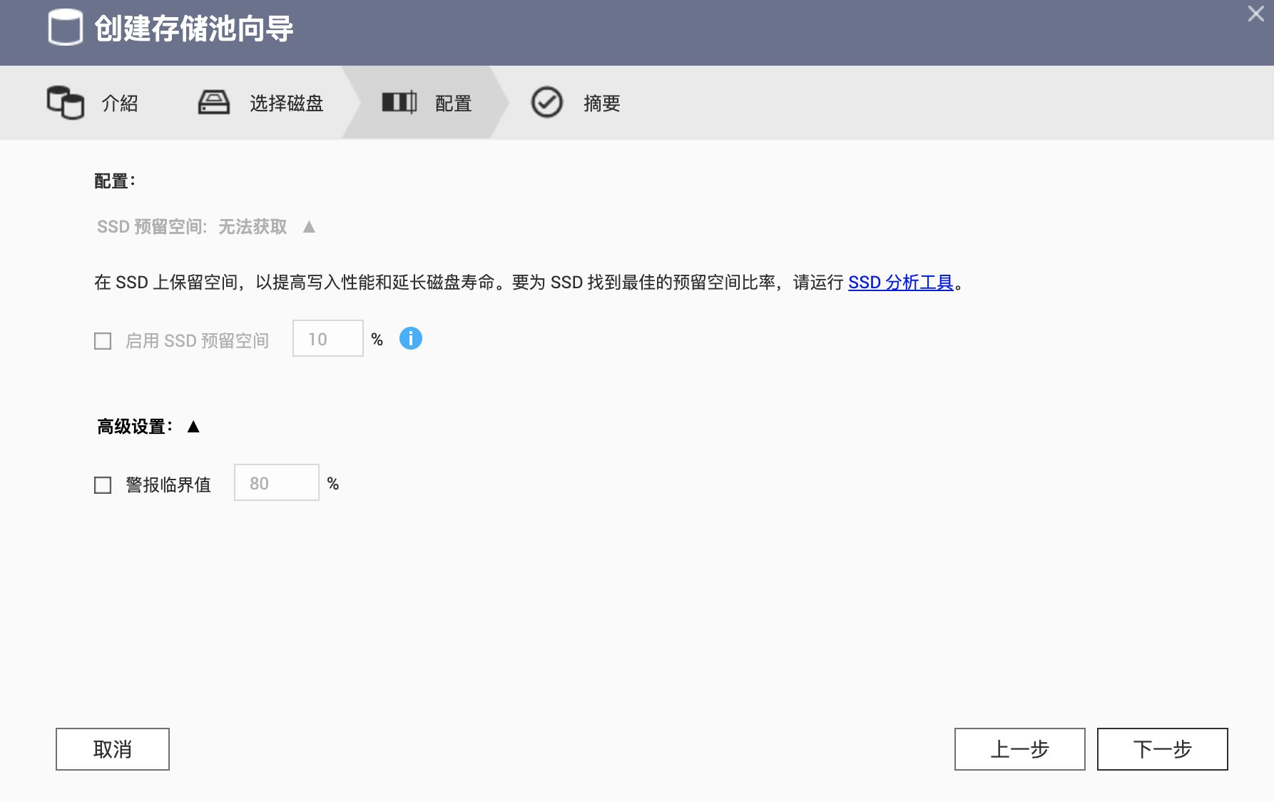 可以看到2个SSD和3个机械硬盘均正确识别,其实可以一步到位设置好最高速度搭配,因为威联通有一个Qtier功能就需要SSD,为了体验一下这个功能有多大的提升,我没有勾选SSD,先将3个硬盘组建Raid5,平衡了读写速率和安全性。