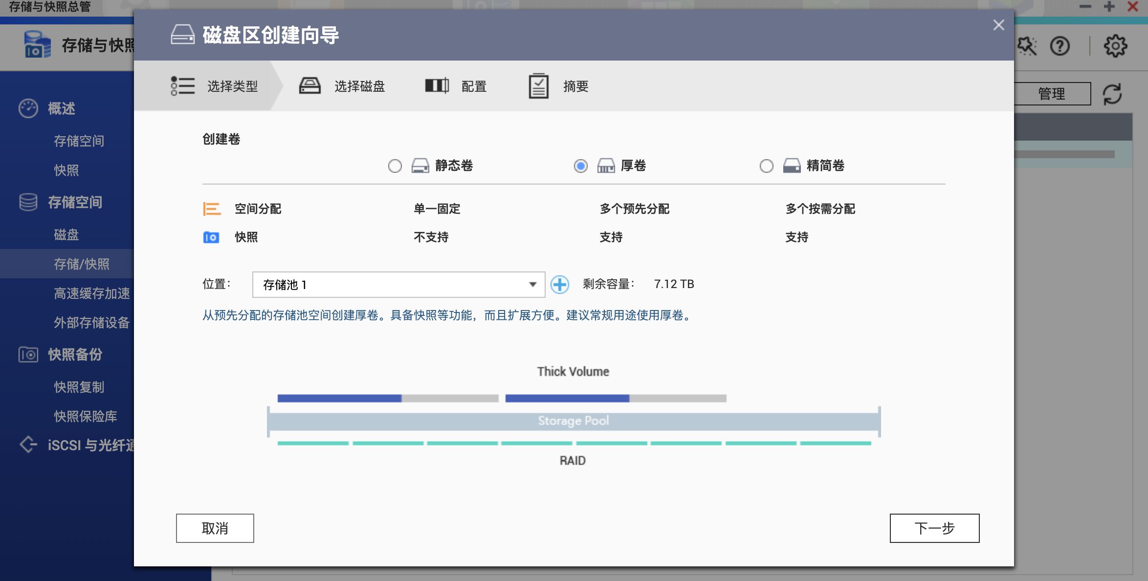 然后我们需要创建一个新卷,和windows相比会感觉有点套娃,但是一步步来,都不难。静态卷、厚卷、精简卷定义都不一样。比如可以选个不心疼的硬盘位静态卷纯挂PT,不支持快照,但是随机访问性能比厚卷提高20%。精简卷就是按需使用存储,写多少算多少。