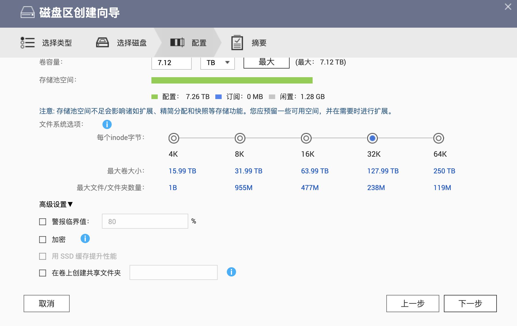 第一次接触建议就用厚卷,其实系统默认也帮你选择了厚卷,剩余容量直接点到了最大,7.12TB。下面的高级设置可以关闭警报临界值。