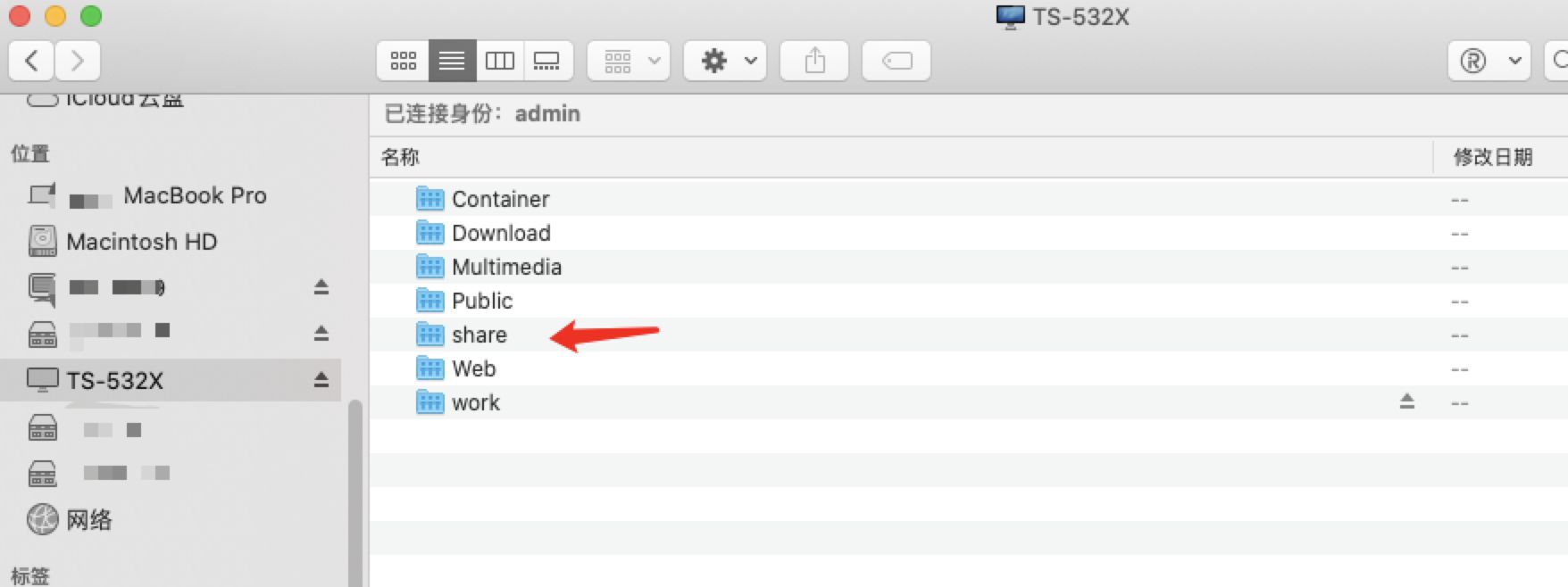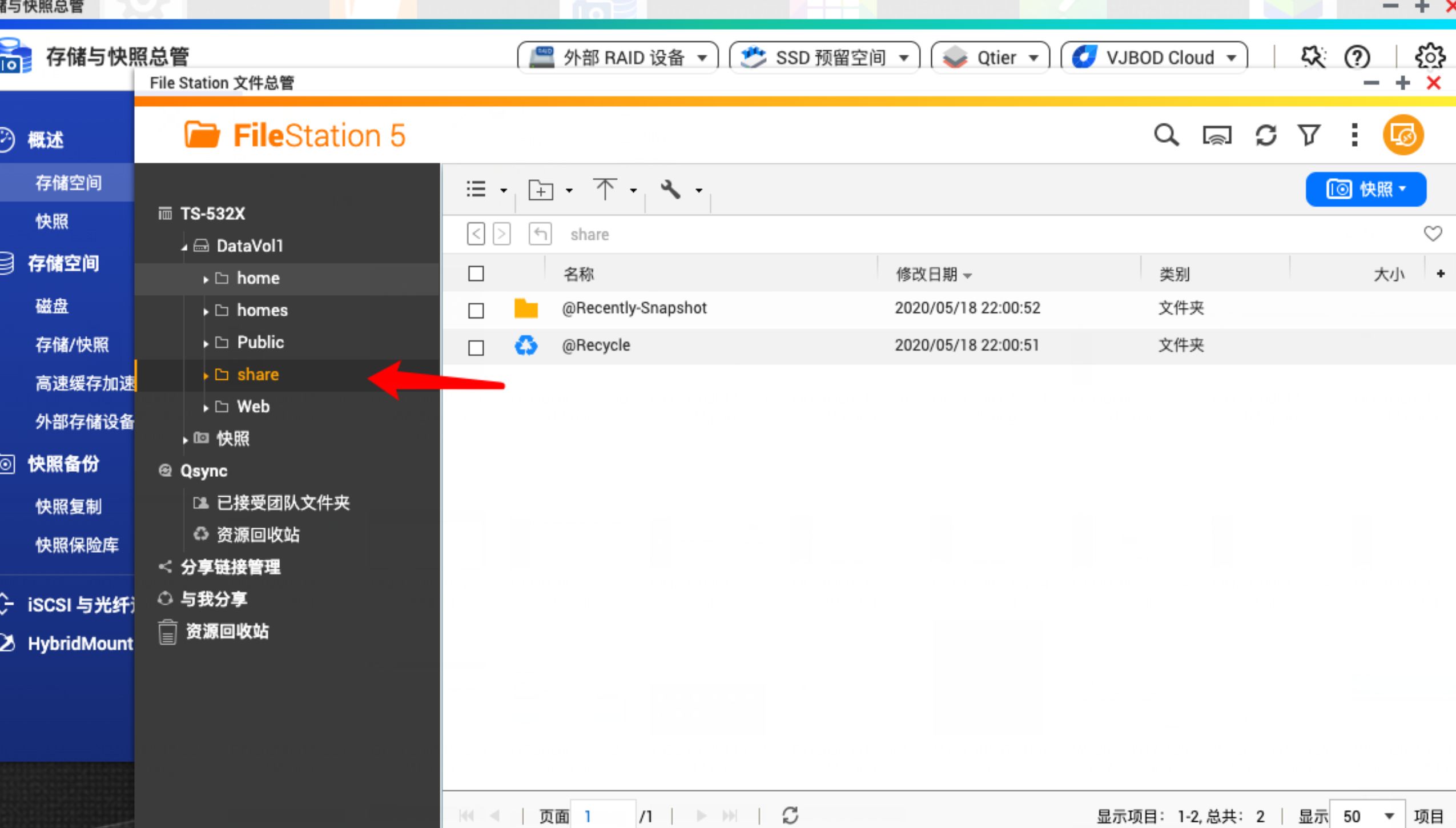 如图,home\homes\Pubilc\web都是威联通一开始自带的文件夹,share是我新建的文件夹。