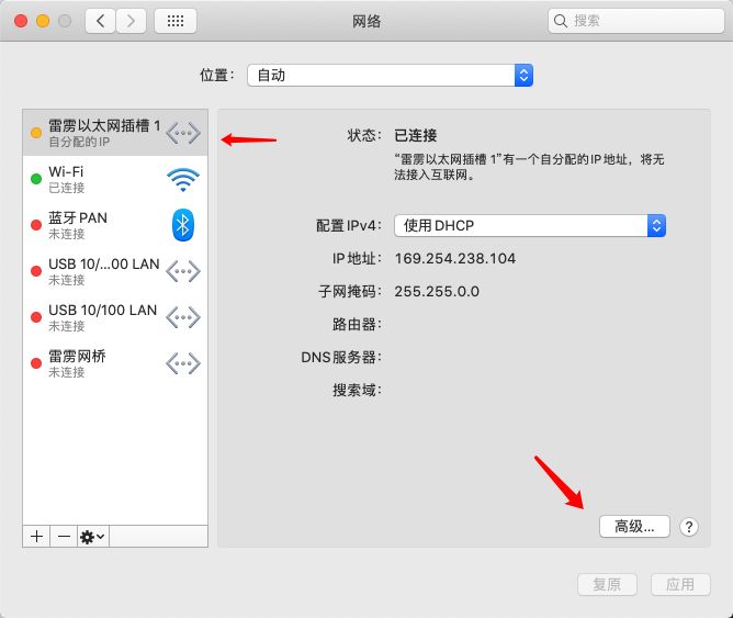 MacOS在网络部分选中雷雳以太网,点击高级。