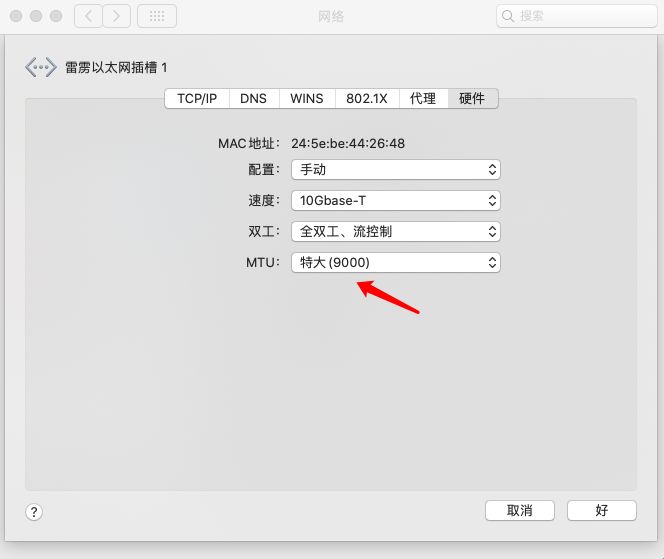 在硬件选项卡下,配置改为手动,下面MTU改为特大(9000)。