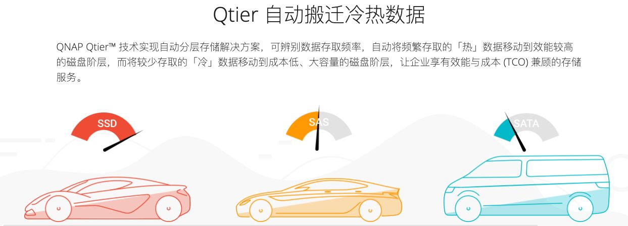 这里就要提到威联通独特的Qtier技术了,简单说就是将经常使用的数据(热数据)放在SSD内,将不经常的数据(冷数据)放在机械硬盘内,来提高读写性能。而且随时可以升级为Qtier,所以一开始如果没有固态硬盘的人完全不用担心。并且和传统的SSD读写加速不一样,读写加速是把SSD作为一个缓存盘,并不永久保存数据,Qtier实际是和机械硬盘的空间相加,我个人感觉有点像混合固态硬盘,好处是空间不浪费。