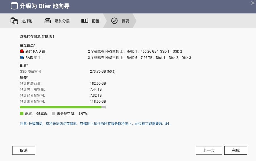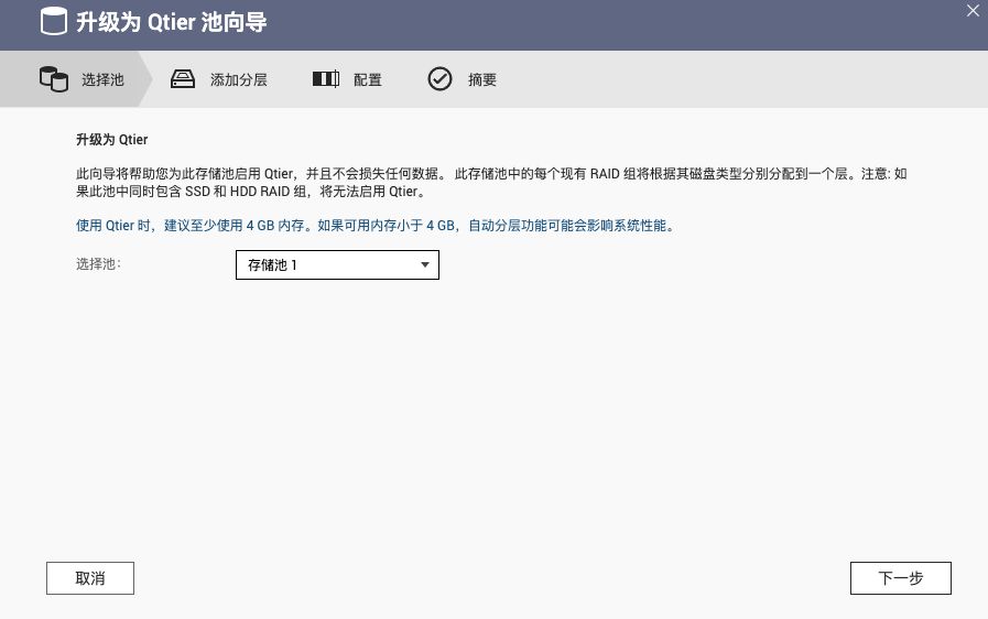 注意这里的提示,使用Qtier时,建议至少使用4GB内存,TS-532X默认2GB的内存估计就比较吃力了,还好刚换了16GB内存。