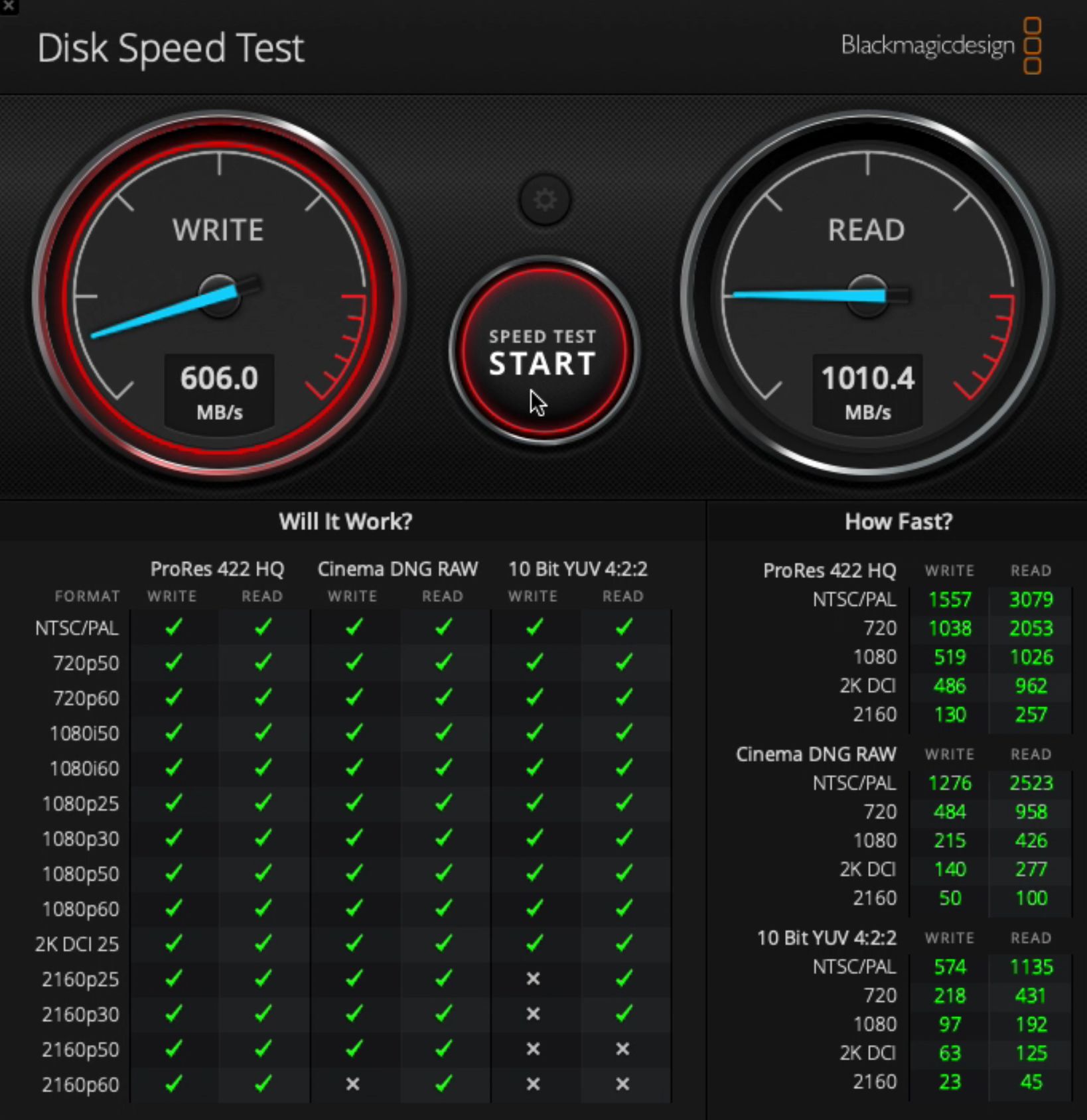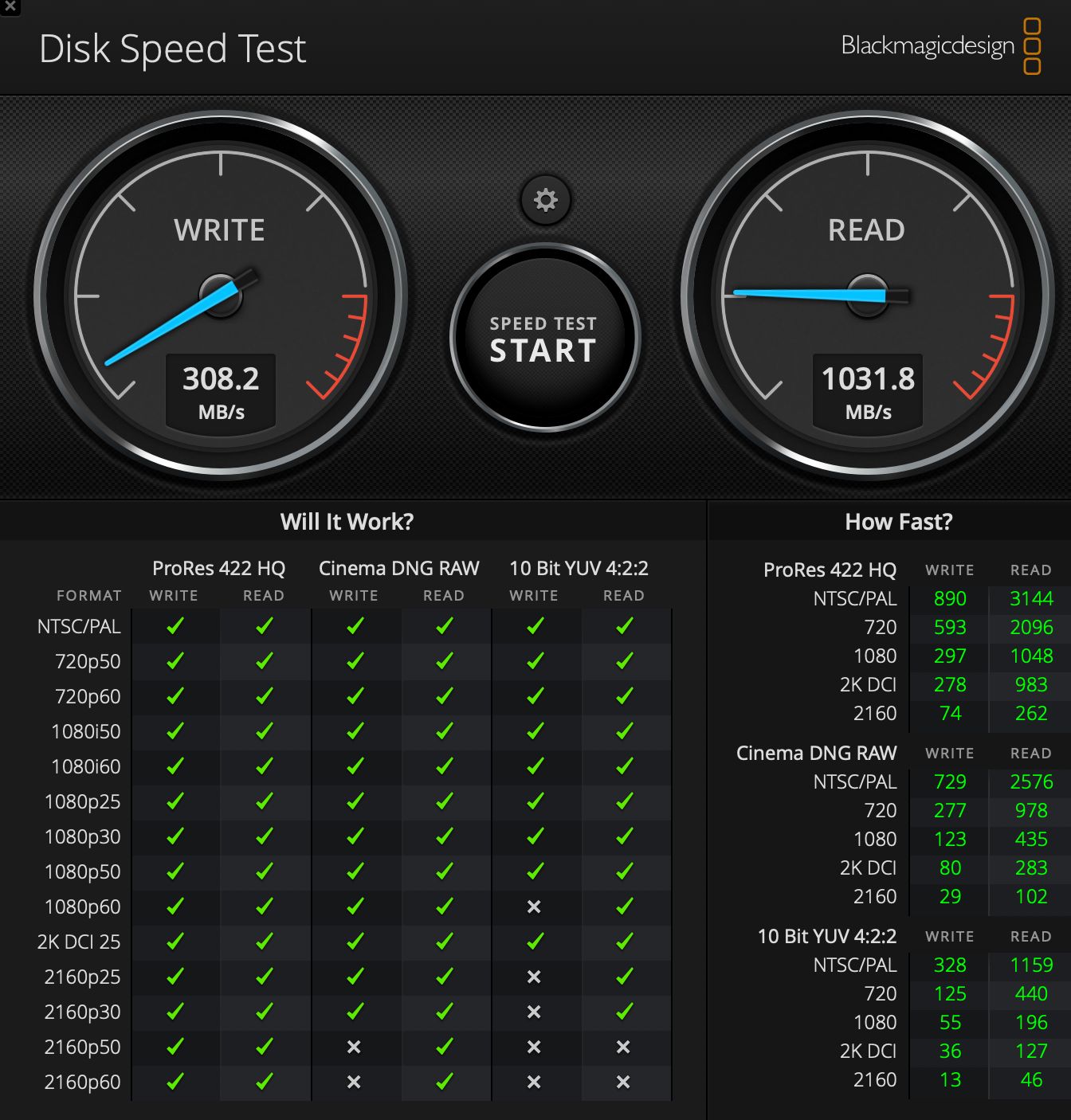 那么将SSD换成RAID0,写速*2,读速*2看看效果,速度一下就起飞了,最高600M,稳定510M的写速,读速依然破千,这就是TS-532X万兆网络的完美形态了,搭配MacBook Pro简直不能太爽。许多人为了节省经费,选择MacBook Pro最爱减配的就是硬盘空间了,但是实际又很需要空间,所以经常挂一个Nvme硬盘盒,读速也最大才1Gb,现在家里的资料都可以放在NAS里,用视频软件也可以顺畅的预览4K素材并剪辑了。