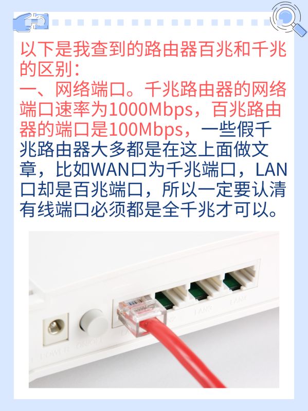 一、网络端口。千兆路由器的端口速率为1000Mbps,百兆路由器为100Mbps。要注意有线端口必须都是全千兆。