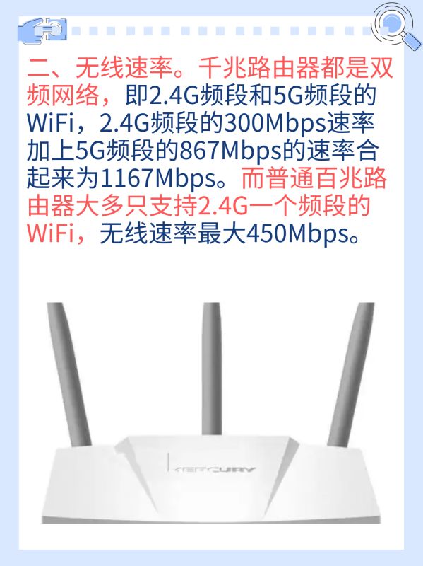 二、无线速率。千兆路由器支持2.4G和5G双频WiFi,速率为1167Mbps。百兆路由器只支持2.4G频段,最大速率为450Mbps。