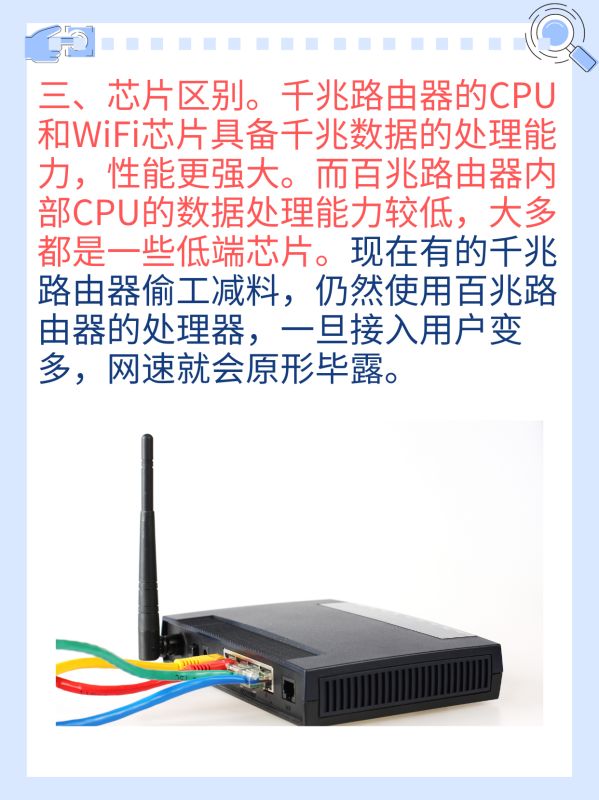 三、芯片区别。千兆路由器的CPU和WiFi芯片处理能力强,性能更好。百兆路由器使用低端芯片,处理能力较低。