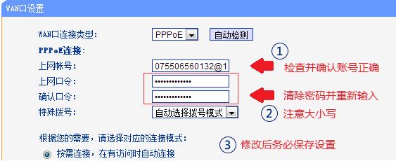 3.上网方式是否现则正确,一般选择PPPOE,其他的参数不要乱改,使用默认就行。设置完毕记得保存和重启路由器。