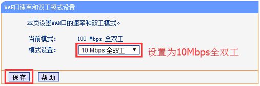 在管理界面点击 网络参数>>WAN口速率模式,将模式设置调整为10Mbps全双工,