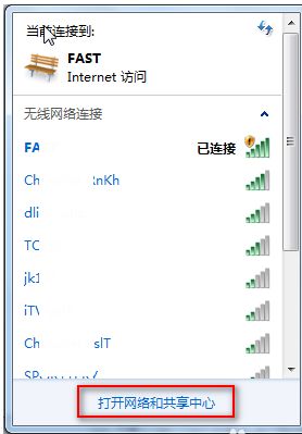 1.系统右下角打开网络和共享中心,如图无线路由连接,所以点击无线图标,弹出的对话框点击打开网络和共享中心。