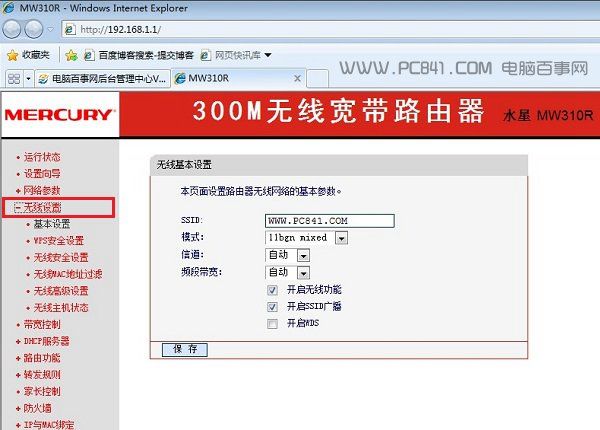2、在无线设置展开的设置选项中,再点击【无线安全设置】,然后在右侧找到“PSK密码”这个就是WiFi密码,例如小编将这里当前的WiFi密码【WWW.PC841.COM】改成新的WiFi密码,新密码需要8位以上字母或者数字,为了防止被蹭网,密码最好包含字母和数字,并且不容易被他人知道的密码,完成后记得点击底部的【保存】即可,如图所示。