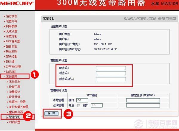 1、在上面打开的水星路由器管理设置界面,点击左侧底部的【系统工具】,在展开的更多菜单中,点击【管理控制】,之后在右侧就可以修改管理员登陆密码了,如下图所示。